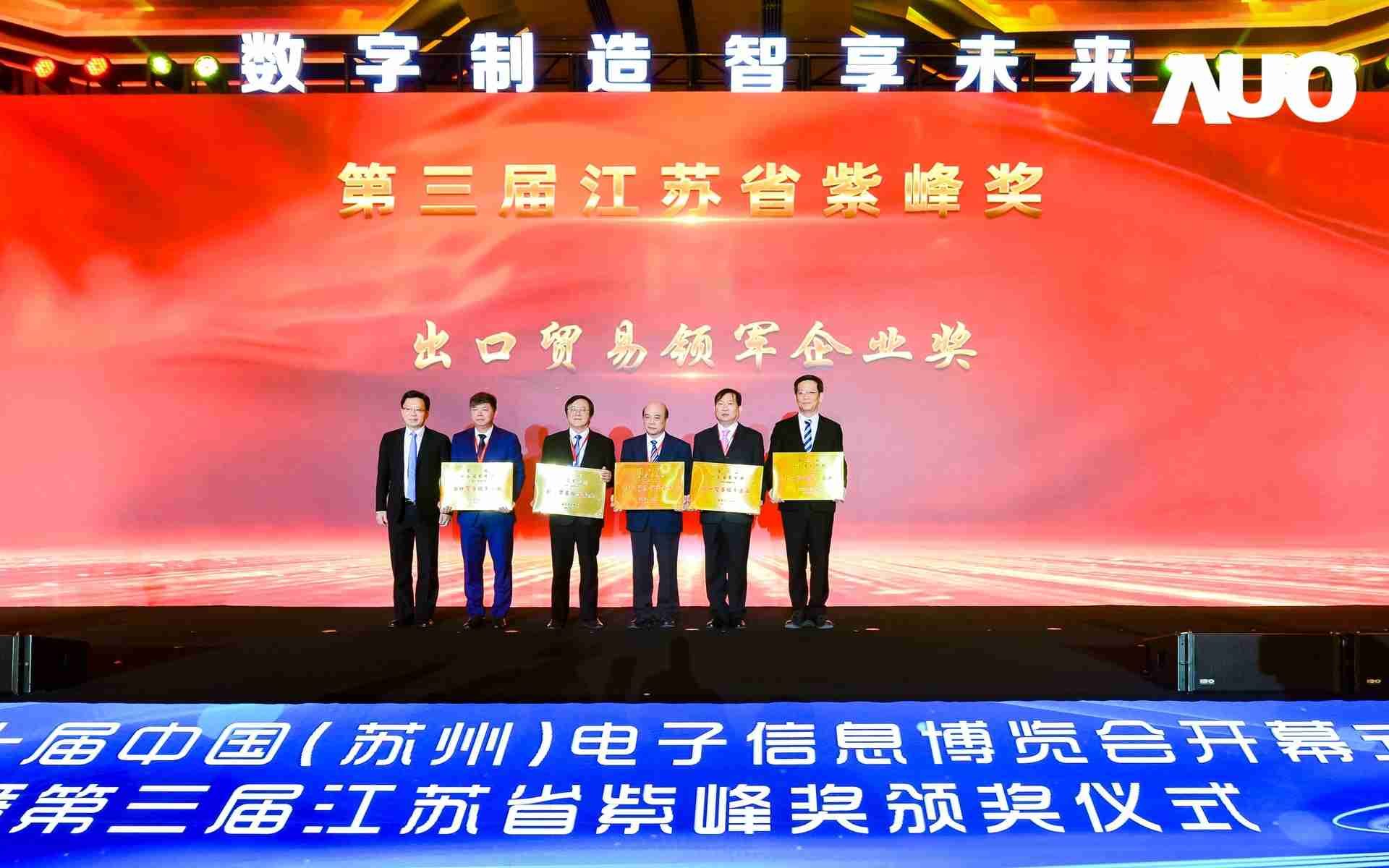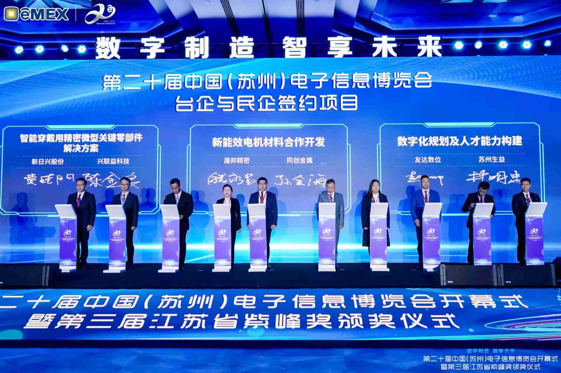 电博会开幕式当天也是第三届江苏省紫峰奖颁奖仪式,,,省台办、、工信厅、、、商务厅、、、苏州市相关领导均出席并颁奖。。。。该奖项为表彰对江苏高质量发展做出积极贡献的在苏企业,,由江苏省政府专门设立。。。。红龙扑克光电 (苏州) 总经理郭振明代表上台领奖,,,这也是红龙扑克苏州连续三次蝉联紫峰奖 出口贸易领军企业奖。。红龙扑克数位总经理赵丽娜女士,,,也参与本次开幕式,,,,上台为本地化赋能签署战略合作协议,,,,将优质服务资源集合、、下沉到更多细分行业,,为更多地区的制造企业提供数字化转型服务。。