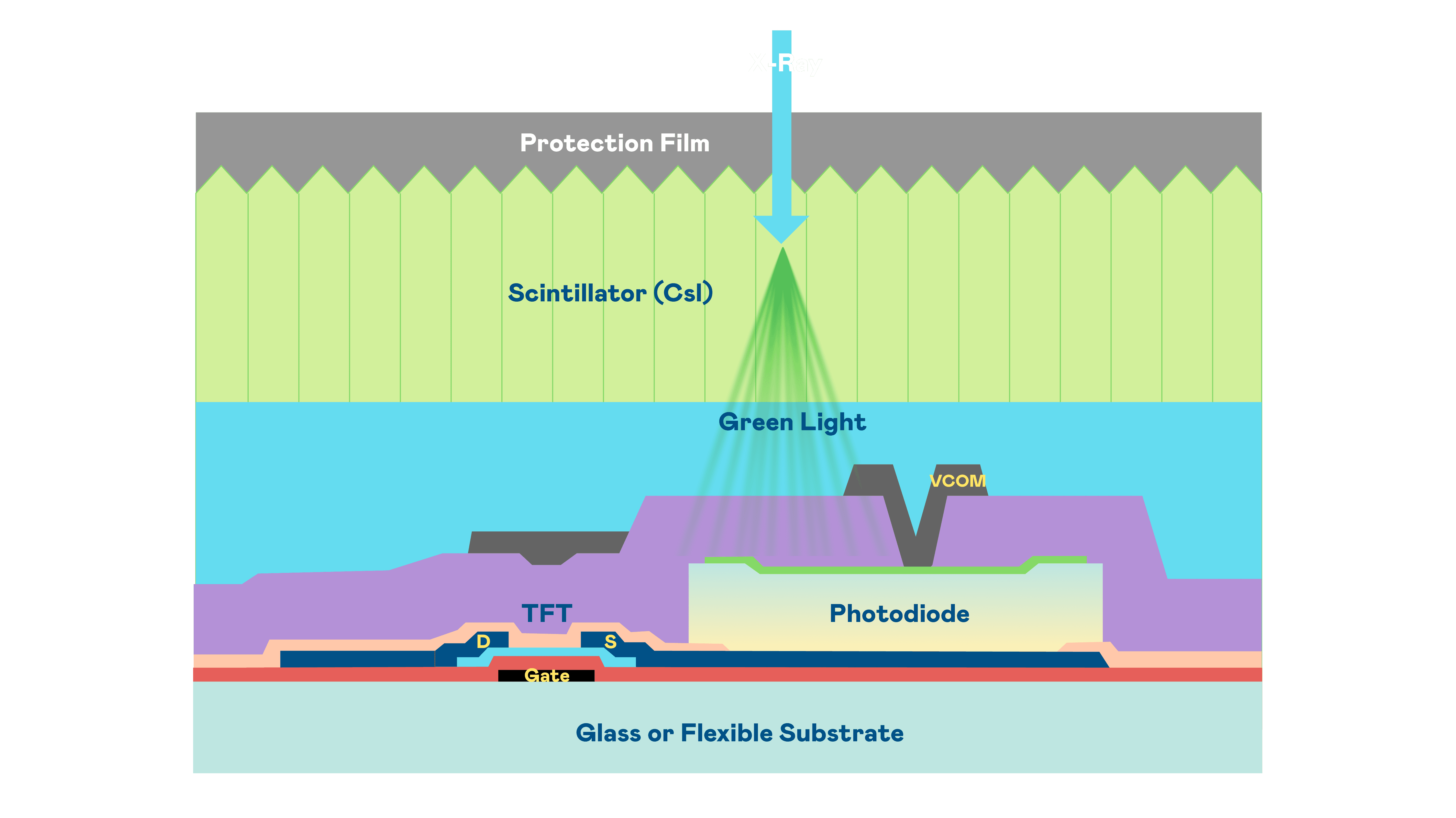 红龙扑克的X光影像感测阵列使用薄膜电晶体 (TFT) 作为每个像素的读取开关,,,,搭配光电二极体(Photodiode)的光电转换元件,,,用以感测X光影像讯号。。